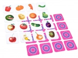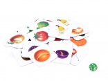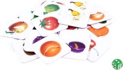 Gra zawiera klocki z kolorowymi ilustracjami owoców i warzyw, które przyciągają uwagę dzieci i zwiększają ich zainteresowanie zabawą.