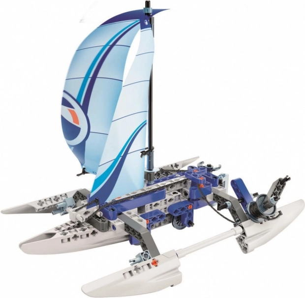 Zestaw do budowy 10 modeli statków, które naprawdę pływają. Główny model, trimaran, jest wyposażony w regulowany ster i żagle.W rzeczywistości pływa 10 różnych modeli. Bezpłatna aplikacja z interaktywną instrukcją 3D.Wyprodukowano we Włoszech.