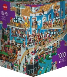 Puzzle Chaotyczne Kasyno od HEYE oferują wyjątkowe wyzwanie z 1000 elementami, idealne dla fanów kolorowych i zabawnych karykatur. Opakowanie zawiera nietypowe trójboczne pudełko oraz plakat jako wzór.