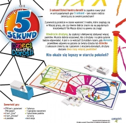 Potrafisz pod presją czasu wymienić trzy rzeczy? Gra 5 SEKUND: Dzieci vs. dorośli marki TREFL sprawdzi twoją szybkość reakcji, kreatywność i ducha zespołowego. Kolorowe karty są przygotowane dla dzieci, czarno-białe dla dorosłych – a gdy ktoś poprawnie odpowie na „obcą” kartę, drużyna zdobywa podwójne punkty!