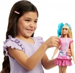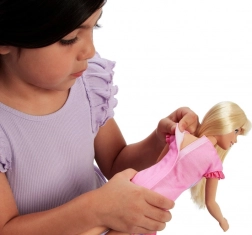 Wejdź do świata, w którym zaczyna się przyjaźń, a wyobraźnia nie zna granic. Lalka z linii Moja pierwsza BARBIE jest większa, lekka i przyjemnie elastyczna, dzięki czemu małe rączki mogą ją łatwo trzymać, ubierać i ustawiać w pozach. Różową sukienkę zdobią figlarne detale, takie jak falbanki i grafika torebki w kształcie serduszka; do kompletu są pasująca opaska i buciki. Długie blond włosy zachęcają do czesania i tworzenia fryzur, co naturalnie rozwija małą motorykę.