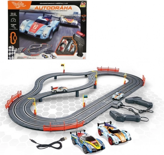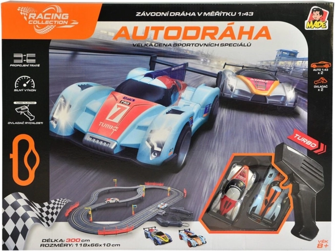 W zestawie znajdują się dwa samochody wyścigowe oraz dwa ręczne kontrolery do natychmiastowych startów i precyzyjnej kontroli prędkości. Autodrom jest zapakowany w polskie pudełko i idealnie sprawdzi się jako prezent dla małych i dużych miłośników wyścigów.