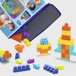 W opakowaniu znajdziesz 150 dużych klocków, w tym specjalne elementy: podstawę z kółkami do pojazdów, klocki z oczami do zabawnych postaci, listki do motywów przyrodniczych oraz elementy dachu do budowli. Wszystko jest w pełni kompatybilne z innymi zestawami MEGA BLOKS, więc zestaw można dowolnie rozbudowywać.