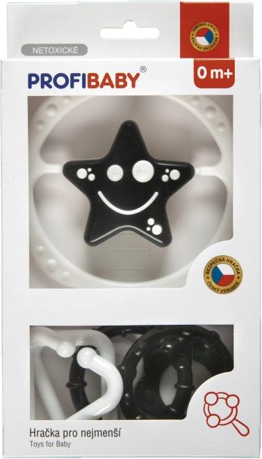 Praktyczny czarno-biały zestaw grzechotek dla niemowląt łączy łańcuszek do wózka oraz osobną grzechotkę w kształcie gwiazdki lub kwiatuszka. Kontrastowe kolory wspierają percepcję wzrokową, a delikatny dźwięk i bezpieczne kształty rozwijają motorykę i zmysły dziecka. Grzechotki są zaprojektowane do wygodnego chwytania i spełniają rygorystyczne normy higieniczne. Bez ostrych krawędzi, bez małych odłączalnych elementów, idealne do codziennej zabawy w domu i w podróży.