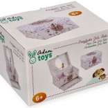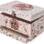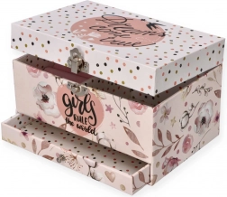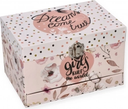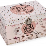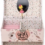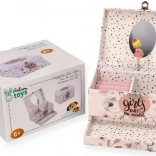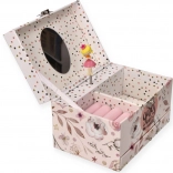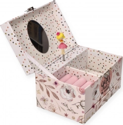Ta delikatna różowa szkatułka z kwiatowym i groszkowym motywem skrywa wszystko, co kochają małe damy: po otwarciu wieczka rozbrzmiewa melodia, a na trzpieniu zaczyna obracać się balerina przed owalnym lusterkiem. W środku znajduje się praktycznie zaprojektowana przestrzeń z poduszeczkami na pierścionki i przegródkami na drobne skarby.
