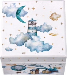 Ta pozytywka jest ozdobiona czarującymi ilustracjami latarni morskich, balonów i gwiazd, co dodaje nuty fantazji każdemu pokojowi.