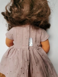 Pielęgnacja jest prosta – aby zachować charakterystyczną strukturę muślinu, zalecamy prasowanie w niskiej temperaturze lub wyrównanie parą. Sukienka idealnie pasuje do lalek o wysokości 38 cm i doskonale sprawdzi się w dziecięcym świecie zabawy.