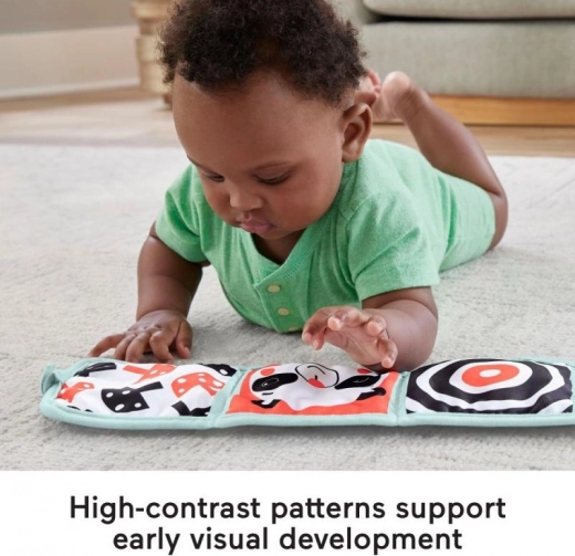 Odkrywajcie świat razem z maluszkiem dzięki miękkiemu składanemu panelowi FISHER‑PRICE Fold & Play. Każda z czterech dwustronnych stron kryje atrakcyjną aktywność: lusterko wspierające poznawanie siebie, szeleszczące tekstury, ruchome klapki, grzechoczące koraliki i inne bodźce dotykowe. Wysoki kontrast wspiera rozwój wzroku noworodków, a kolory i zwierzątka rozbudzają naturalną ciekawość.