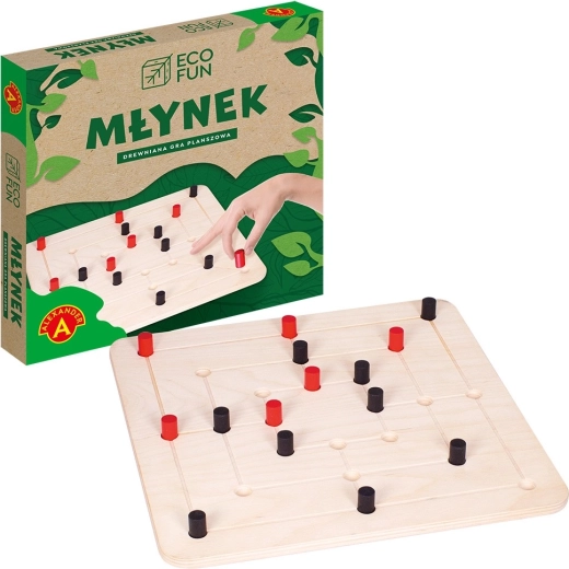 To jedna z gier uznawanych za ponadczasowe. W wersji ECO FUN gracze mogą teraz cieszyć się ekologiczną odsłoną dzięki wykonaniu wszystkich elementów z drewna. Młynek to gra logiczna przeznaczona dla dwóch osób. Celem gry jest zbicie pionków przeciwnika poprzez układanie tzw. młynów, czyli ciągów 3 znaczników w tym samym kolorze w jednej linii.