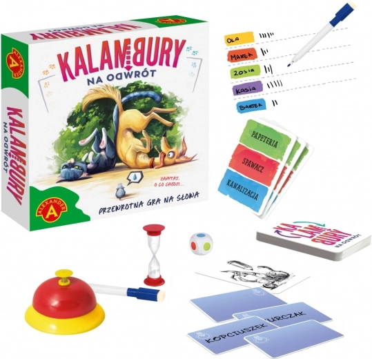 Ta gra wielokrotnie zmusi was do stawania na głowie jak postacie na okładce. Na szczęście nie będziecie musieli wykazywać się nadzwyczajną sprawnością fizyczną. Nie oznacza to jednak, że będzie łatwo! Gracze w grze Puns in Reverse zmierzą się z niełatwym zadaniem odgadnięcia właściwego hasła, które prezentowane jest słowami, a nie gestami i mimiką jak wcześniej. Aby zdobyć jak najwięcej punktów, uczestnicy muszą rozwiązać zagadkę i ułożyć pytanie zawierające poprawne hasło. Grę urozmaicają 2 typy kart. Dzięki nim gracze mogą z łatwością wprowadzać do rozgrywki własne propozycje gier słownych.