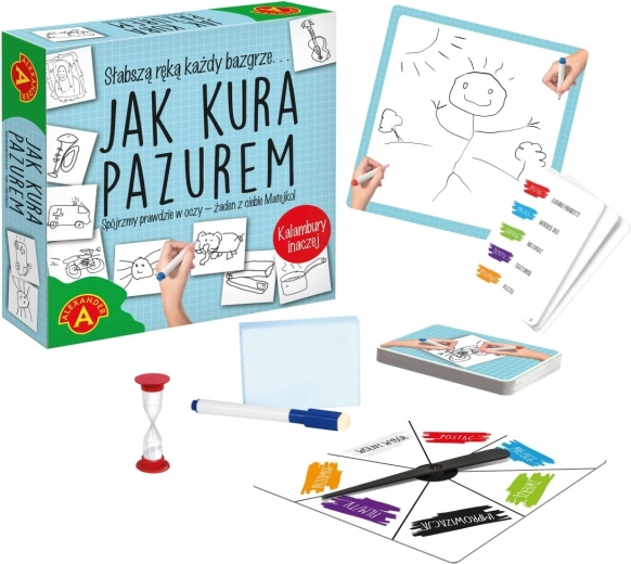 Gra Jak podrapać kurę to zabawa dla osób, które cenią świetną rozrywkę i mają nieograniczoną wyobraźnię. Gracze stają przed wyzwaniem ilustrowania haseł tak, aby przeciwnicy je odgadli. Muszą to jednak robić słabszą ręką, a po wyciągnięciu specjalnej karty nawet trzymać marker stopą lub w ustach! Prawdziwe szaleństwo narasta dzięki zwariowanym hasłom, takim jak Laponia, Piraci z Karaibów czy brzytwa. Dodatkowym atutem jest możliwość dodawania własnych pomysłów! To świetna zabawa dla wszystkich grup wiekowych.
