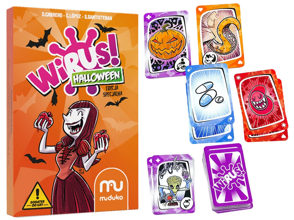 Rozszerz swoją ulubioną grę WIRUS o tematyczną talię HALLOWEEN! Ten dodatek wprowadza 15 nowych kart pełnych napięcia, dreszczyku i zabawnych zwrotów akcji. Czekają na ciebie straszne efekty, szalone nietoperze, zjawy oraz halloweenowe triki. Uwaga: to nie jest samodzielna gra – wymaga podstawowej wersji gry WIRUS.