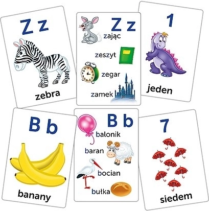 Obrazkowe karty edukacyjne to praktyczna pomoc przeznaczona dla najmłodszych dzieci, które uczą się alfabetu i cyfr. Świetnie sprawdzą się do nauki w przedszkolu i w domu. Zestaw zawiera 27 dwustronnych kart z literami oraz 5 z cyframi.