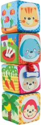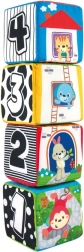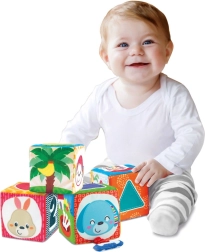 Odkryj zestaw 4 kolorowych, tekstylnych klocków dla niemowląt i maluchów, które rozwijają percepcję sensoryczną, motorykę małą oraz naukę liczb i kształtów. Każdy klocek ma różne faktury, bezpieczne lusterko oraz ilustracje zwierzątek, liczb i kształtów. Klocki można układać w stabilną piramidę i tworzyć z nich serię obrazków dla zabawnej nauki.