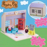 Budynek szkoły, figurki (Świnka Peppa, Tomek, pani Gazela), biblioteka, tablica, stół, krzesła