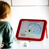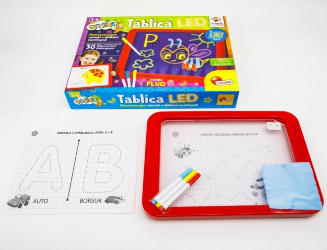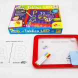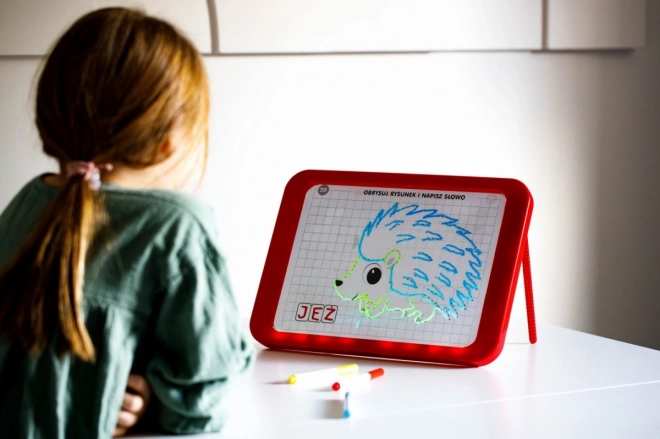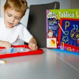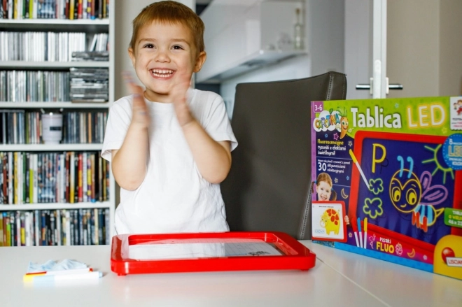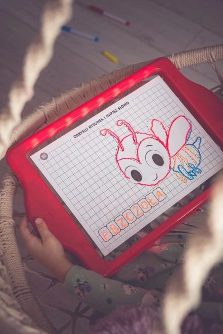 Tablica LED Carotina to idealne narzędzie edukacyjne dla dzieci. Oferuje program edukacyjny oparty na 30 kartach dydaktycznych, które można wykorzystać za pomocą metody kalkowania. Wystarczy umieścić kartę na papierowej podstawie i włożyć pod przezroczysty ekran tablicy. Rysowanie odbywa się za pomocą trzech fluorescencyjnych markerów, które są częścią zestawu. Dzięki tym markerom dzieci mogą rysować wielokrotnie i zmazywać rysunki za pomocą suchej ściereczki. Tablica LED jest wszechstronna jak klasyczna tablica i świeci niemal jak neonowy znak!