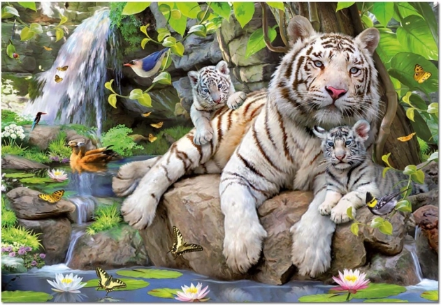Seria puzzli Białe Tygrysy oferuje zachwycającą scenę z białymi tygrysami w bujnej dżungli. Te puzzle z 1000 elementów zapewniają nie tylko rozrywkę, ale także trening umysłu; dzięki swojej trwałości i eleganckim kolorom to idealny prezent!