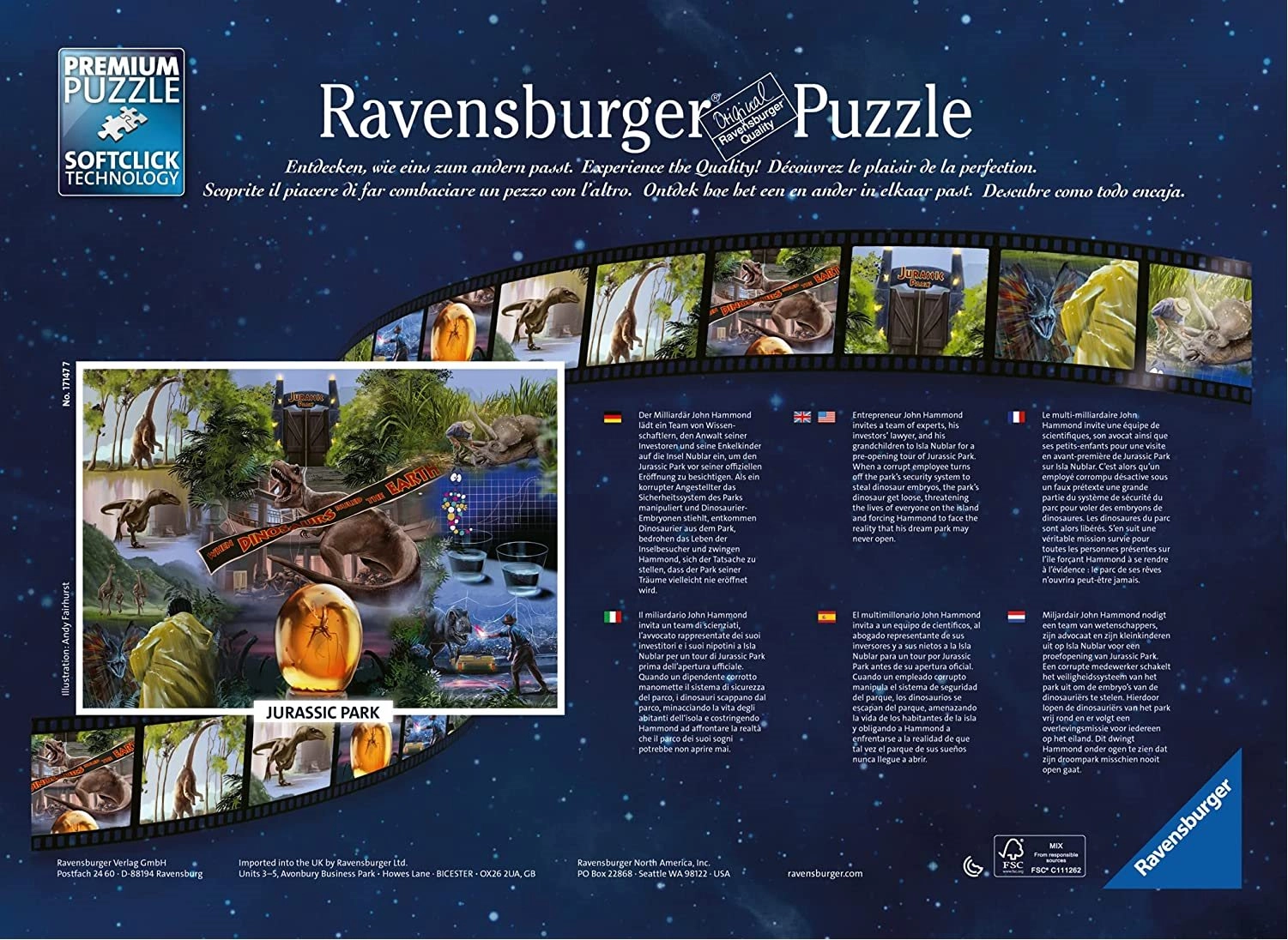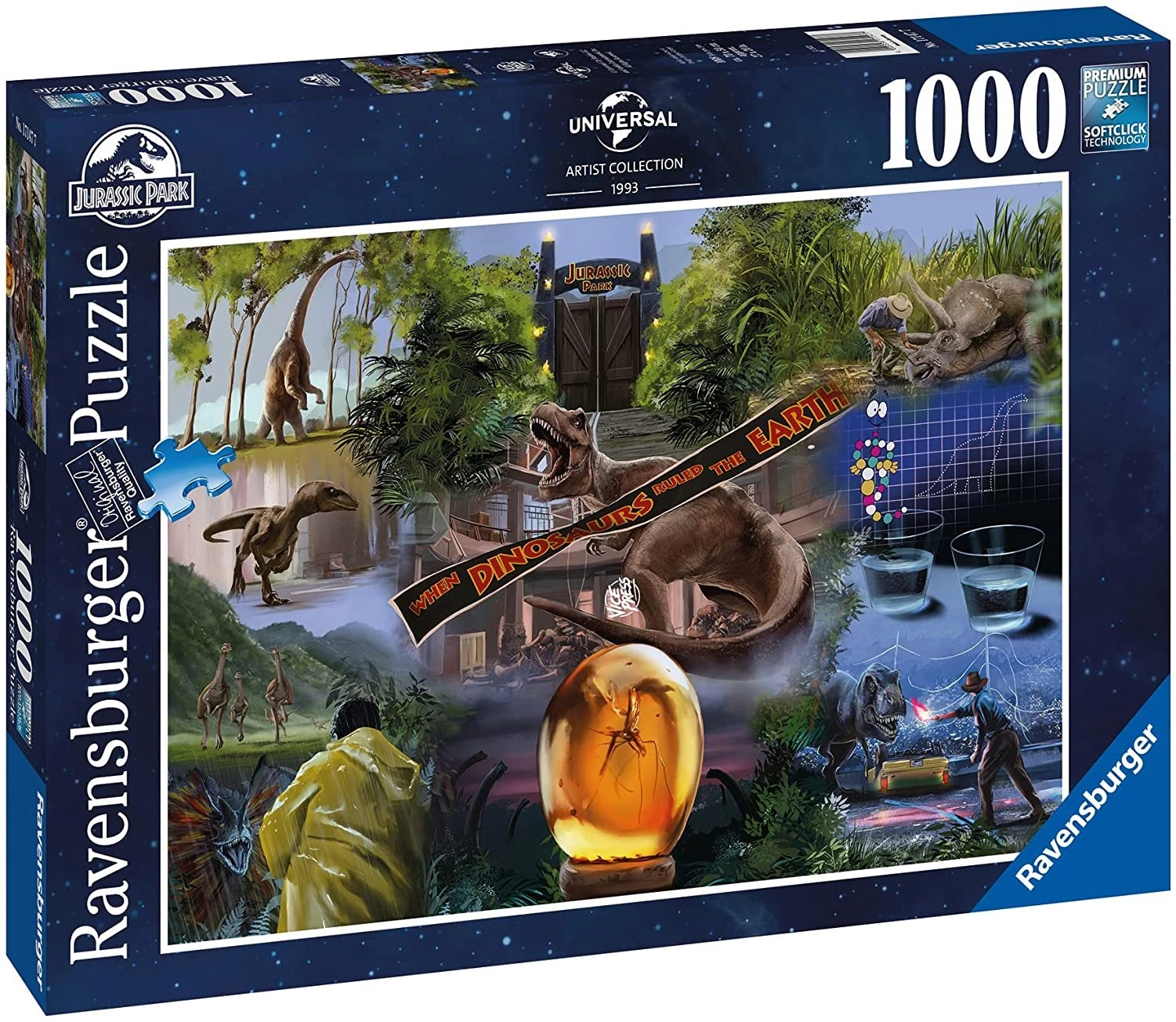 Seria puzzli Ravensburger 1000 elementów oferuje wyjątkowe i interesujące wzory do układania, w tym przypadku układankę z motywem z filmu Park Jurajski.