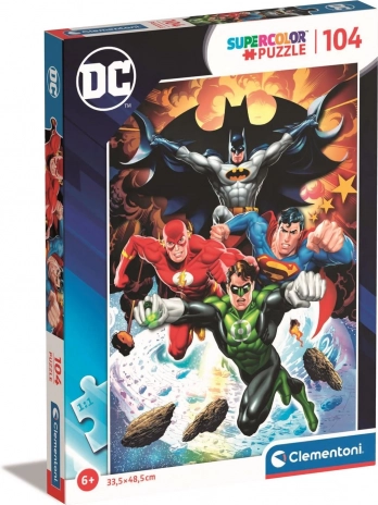 Dziecięce puzzle CLEMENTONI DC Comics SuperColor, 104 elementy. Żywe kolory, wysokiej jakości druk, wymiary 33,5 × 48,5 cm. Rozwijają motorykę i koncentrację.