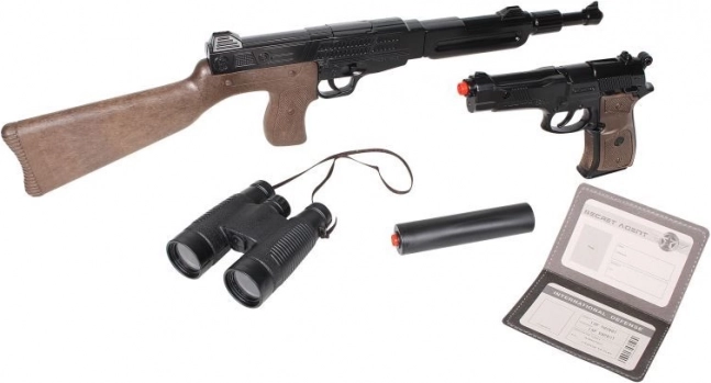 - metalowy karabin, pistolet na 8 naboi z magazynkiem, lornetka, legitymacja tajnego agenta
