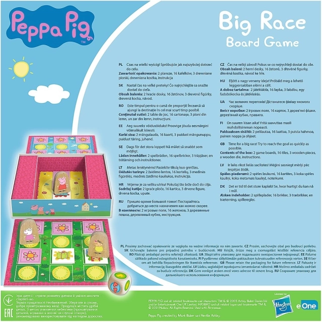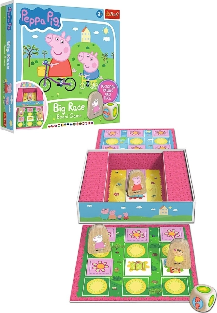 Big Race (Wielki wyścig) to wesoła i prosta gra planszowa na licencji Świnki Peppy, w której dzieci doświadczą swoich pierwszych wygranych i przegranych. Rzucaj dużą drewnianą kostką, przesuwaj swoje drewniane pionki po kolorowej planszy i odkrywaj karty ze specjalnymi akcjami – dodatkowy rzut, zamiana pionka, krok do przodu lub do tyłu. Cel jest jasny: bądź pierwszy, kto opuści planszę, i wygraj wielki wyścig!