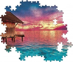 Zanurz się w medytacyjnym rytmie układania z puzzlami CLEMENTONI Peace – Living the Present. Nasycone kolory, staranny nadruk i perfekcyjnie dopasowane elementy zapewniają przyjemne wrażenia oraz piękny obrazek chatki na palach nad spokojną taflą wody o zachodzie słońca.