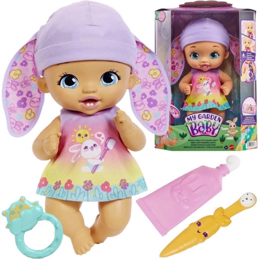 Urocza lalka MY GARDEN BABY w króliczym stylu oferuje interaktywną opiekę nad niemowlęciem i naukę higieny z szczoteczką i „pastą” do zębów. Ma duże niebieskie oczy, mięciutką czapeczkę z uszkami, dwustronną sukienkę dzień/noc oraz opakowanie, które zamienia się w kołyskę. Idealna do rozwoju empatii, opiekuńczości i wyobraźni.