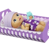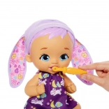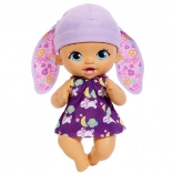 Lalka jest wykonana z wytrzymałego plastiku, ma wyraziste niebieskie oczy, słodkie usta i fioletową czapeczkę z króliczymi uszkami. W zestawie znajduje się także gryzak, który wspiera zabawę sensoryczną. Opakowanie sprzyja zrównoważeniu – po rozpakowaniu służy jako praktyczna kołyska.