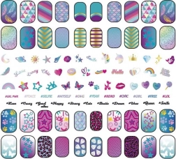 Kolorowe lakiery, sztuczne paznokcie i tematyczne naklejki do kreatywnego miksowania motywów od gwiazdek po paski i gradienty.
