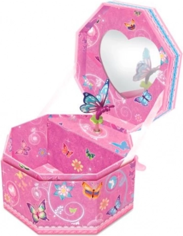 Urokliwa muzyczna szkatułka na biżuterię z motylkami zachwyci małych i dużych miłośników pięknych detali. Po otwarciu rozbrzmiewa klasyczna melodia, a figurka zaczyna się poruszać. Szkatułka ma lustereczko oraz miejsce na drobiazgi, działa na nakręcany mechanizm bez baterii.