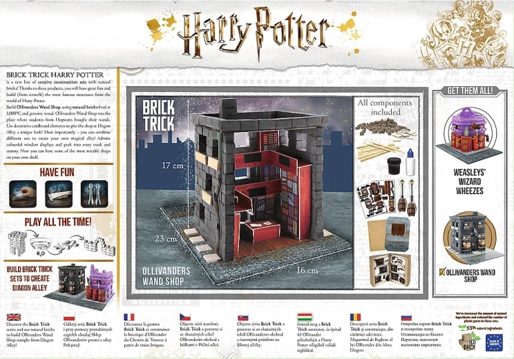 Stwórz szczegółowy trójwymiarowy model słynnego sklepu z różdżkami i nadaj swojej kolekcji ze świata HARRY POTTER wyjątkowy charakter. Zestaw wykorzystuje prawdziwe mini cegiełki, drewniane elementy oraz dekoracje z kartonu, mchu i kamyków, dzięki czemu gotowa budowla wygląda realistycznie i świetnie sprawdzi się zarówno do zabawy, jak i na ekspozycję.