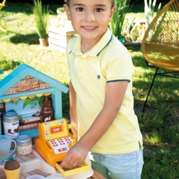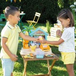 Plażowy bar SMOBY to kreatywny dziecięcy stragan do zabawy w sprzedawcę i klientów. Dzieci wypróbują przygotowanie pucharów lodowych, smoothie i owocowych szaszłyków, dekorowanie polewami i posypkami oraz nabijanie zakupów na funkcyjnej kasie. Realistyczne detale rozwijają wyobraźnię, umiejętności społeczne oraz motorykę małą.