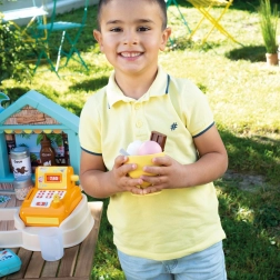 Bogaty zestaw 38 akcesoriów obejmuje wytwornicę lodów, rożki i gałki, łyżkę do lodów, owocowy szaszłyk, posypki, naczynia, sztućce i kasę. Dzięki kompaktowym wymiarom stragan świetnie sprawdzi się w ogrodzie, parku i na plaży – idealny dla małych gospodarzy letnich przyjęć.