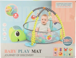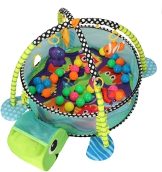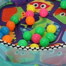 - Zabawki i piłeczki: Mata zawiera kolorowe i miękkie zabawki, takie jak rybka, ośmiornica, gwiazdka oraz pudełeczko z lusterkiem. Dodatkowo 30 plastikowych piłeczek w żywych kolorach stymuluje zmysły dziecka.