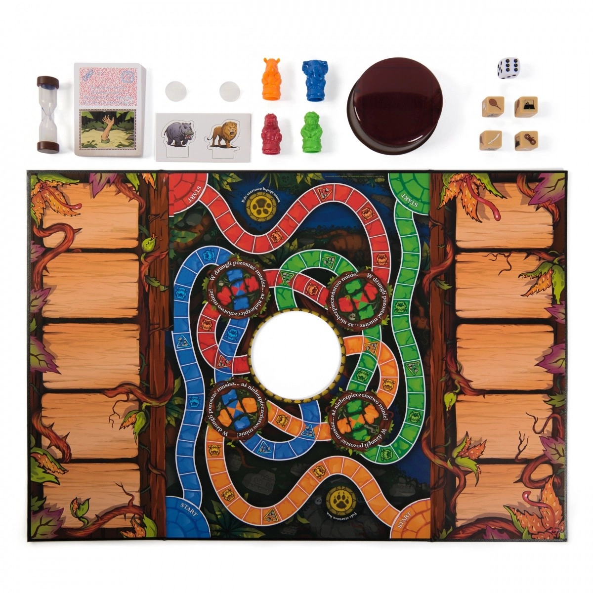 - Atmosfera dżungli – karty fabularne, zadania na czas i symbole na kostkach.