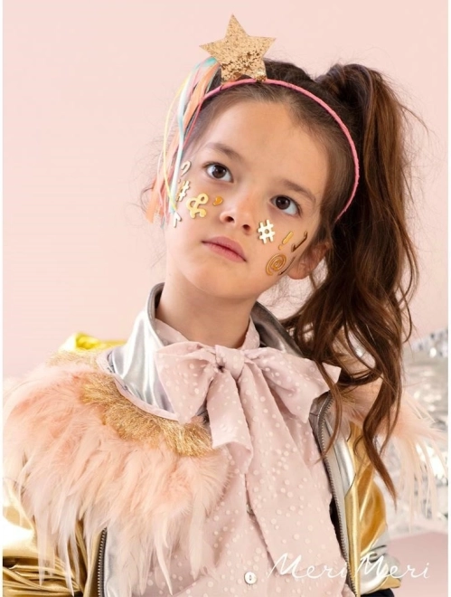 Opaska na głowę Spadająca Gwiazda to elastyczna opaska z tekstylnym pokryciem i błyszczącą gwiazdą z kolorowymi wstążkami, którą docenią zarówno mali, jak i duzi.