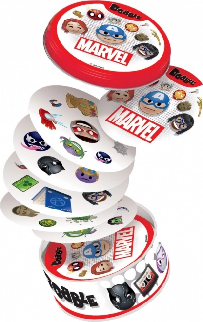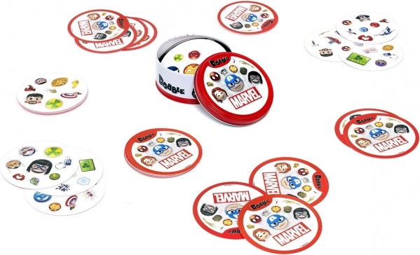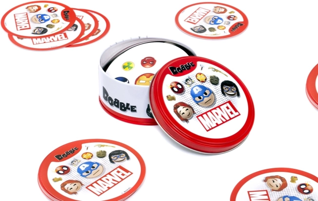 Praktyczne, blaszane opakowanie z logo MARVEL chroni karty i czyni z Dobble idealną grę do plecaka – na wakacje, piknik i wizyty u znajomych.