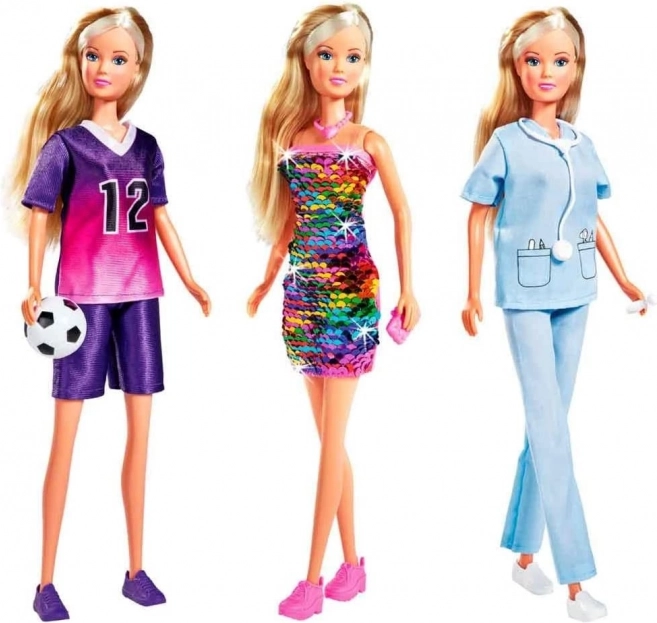 Lalka Steffi i 3 różne ubranka: cekinowa sukienka SWAP, strój lekarski oraz strój piłkarski. Zestaw zawiera akcesoria.
