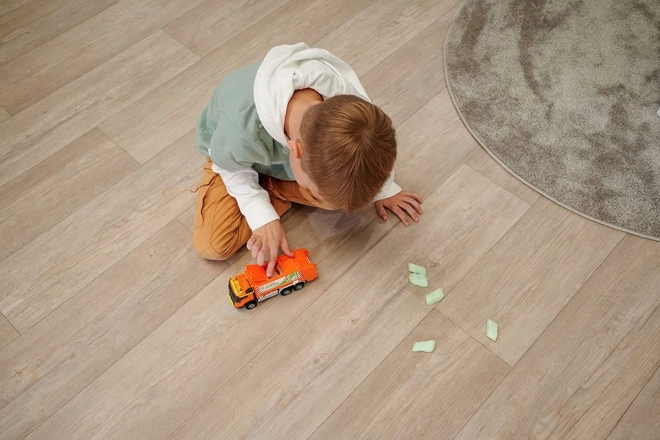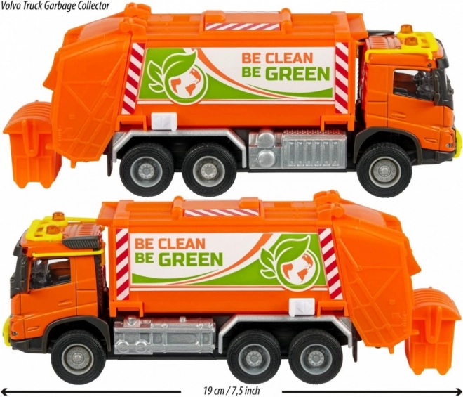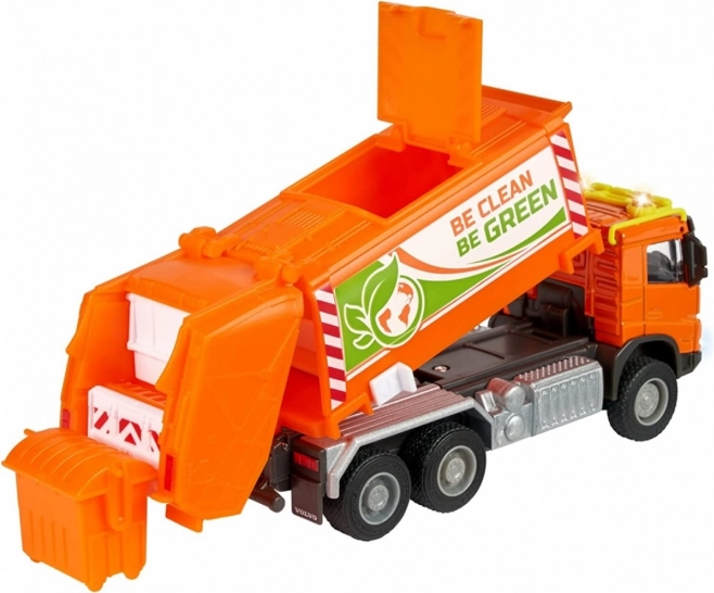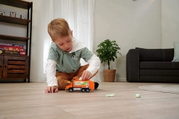 Model w skali 1:43 ma pracujący podnoszony kosz, otwierany właz oraz funkcję wyładunku dla łatwego wysypywania odpadów. Gumowe opony z bieżnikiem radzą sobie z różnymi powierzchniami, a 2 efekty dźwiękowe wraz z przednimi reflektorami i światłami przeciwmgielnymi dodają zabawie autentyczności. W zestawie znajdują się także baterie 2× AAA (R03), więc zabawa może rozpocząć się od razu.