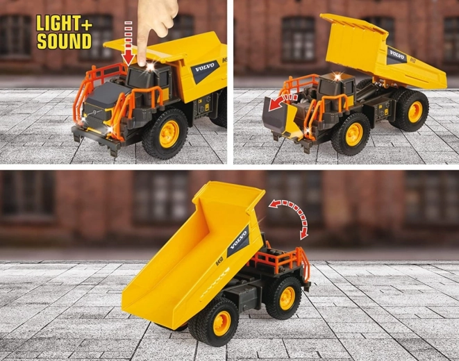Licencjonowana wywrotka VOLVO bez napędu, ze światłami i efektami dźwiękowymi. Kabina wykonana z metalu. Miękkie gumowe opony z łatwością pokonują wymagający teren na placu budowy. Ruchome elementy: maska i wywrotka. Długość: 20 cm.