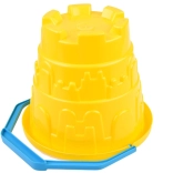 Plastikowe wiaderko z niebieską rączką i foremkami w środku umożliwia łatwe przenoszenie na plażę lub do ogrodu.
