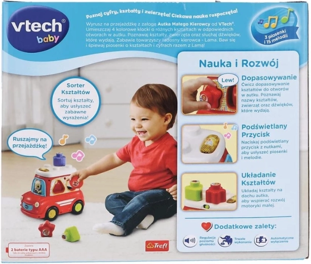 Interaktywne autko VTech to świetny sposób na rozwijanie umiejętności dzieci poprzez zabawę. Mówi w języku polskim, uczy kształtów, liczb i nazw zwierząt oraz ich dźwięków, a dzięki efektom świetlnym i dźwiękowym utrzymuje uwagę malucha. Cztery obrotowe plastikowe koła zapewniają płynny ruch podczas zabawy.