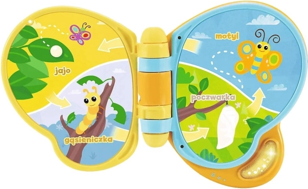 Skrzydła motylka pełnią funkcję otwieranej książeczki, która pomaga rozwijać małą motorykę, ciekawość i pierwszą wiedzę o przyrodzie. Dzieci nauczą się rozpoznawać etapy rozwoju motyla i zdobędą podstawowe informacje o zwierzętach w formie zabawy.
