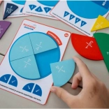 Zestaw zawiera drewniane elementy ilustrujące ułamki 1/2, 1/3, 1/4, 1/5, 1/6, 1/8, 1/10, a także odpowiednie karty pracy.