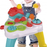 Stolik oferuje szeroki zakres aktywności do rozwijania motorycznych umiejętności dzieci, takich jak zębatki, katapult do klocków i pękające bańki.