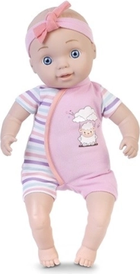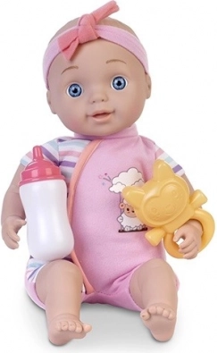 Urocza lalka niemowlę 33 cm zachwyci każde dziecko realistycznymi dźwiękami i bogatymi akcesoriami. Po naciśnięciu brzuszka mówi „mama”, „tata”, płacze i śmieje się. W zestawie znajdują się butelka, gryzak, przytulanka i pudełeczka z detalicznymi reliefami. Lalka ma mięciutkie piżamki i opaskę z kokardką – idealna do zabawy w opiekę.