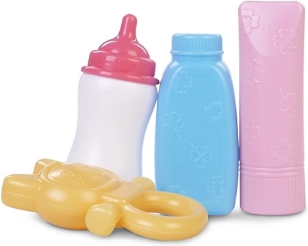 - Bogate akcesoria: butelka, gryzak, przytulanka i pudełeczka z reliefami.