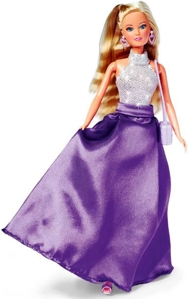 Lalka Steffi w lśniącej srebrno‑fioletowej sukience oczaruje każdą małą stylistkę. Ma długie blond włosy, niebieskie oczy i kolczyki w kształcie serduszek. Dzięki ruchomym rękom, nogom i głowie z łatwością przyjmuje dynamiczne pozy i inspiruje do tworzenia własnych historii. W zestawie znajdziesz także fioletowe szpilki i pasującą torebkę.