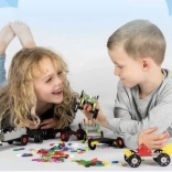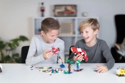 Elementy są umieszczone w wytrzymałym, zamykanym pojemniku, który ułatwia przenoszenie, sortowanie i utrzymanie porządku po każdej zabawie.