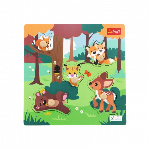 Odkryj wysokiej jakości drewniane puzzle z motywem leśnych zwierzątek dla najmłodszych. Zawierają 5 wyjmowanych elementów z drewnianym uchwytem oraz podkładkę z zaznaczonymi kształtami dla łatwiejszego układania. Ta zabawka wspiera rozwój małej motoryki, naukę kształtów i koordynację oko–ręka. Idealny wybór dla dzieci od 18 miesięcy.